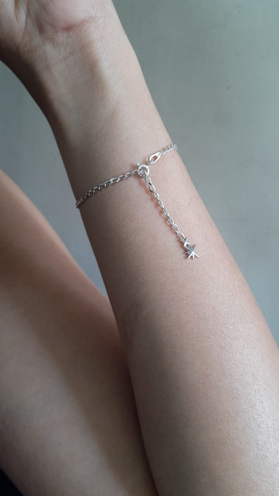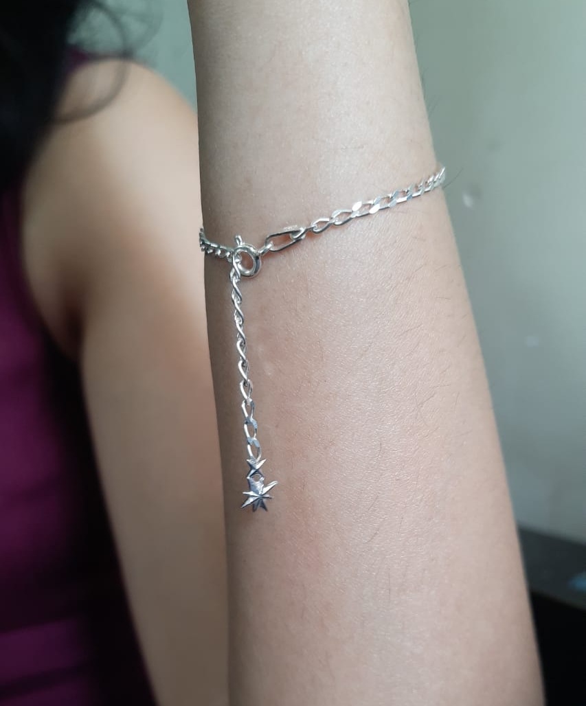 Delicate yet eye-catching, this sterling silver chain bracelet is designed to shine in the simplest way. A sleek, polished chain wraps comfortably around the wrist, finished with a minimal starburst charm that gently dangles at the end for a subtle touch of movement and sparkle.